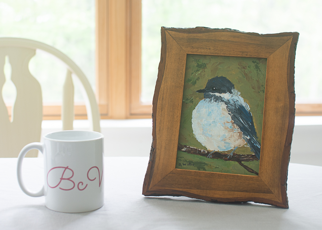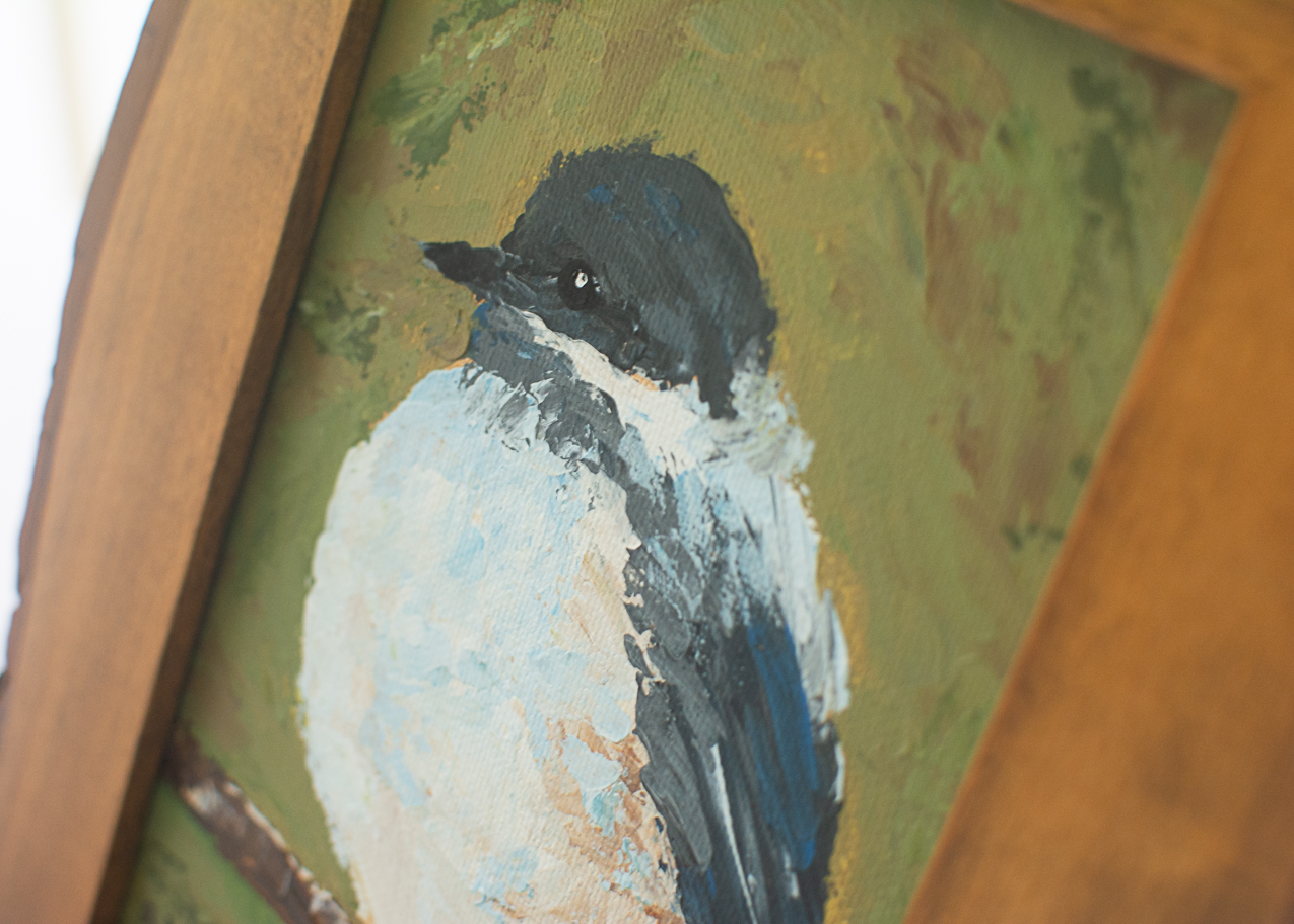 In this original painting, a serene chickadee rests on a branch in tranquil shades of blue and cream, reflecting the quiet grace and enduring promise of freedom.
